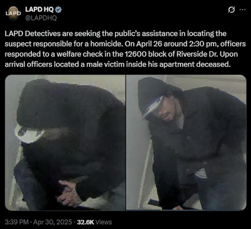 Here are the facts as of now: Early in the morning of April 23, 2025 in the five-story Ashton Sherman Village Apartments, someone reportedly heard a fight in a neighboring unit and a man’s voice saying, “I am going to die. I am going to die.” They called the Los Angeles Police Department. The dispatcher put out the following emergency radio call to any available patrol officers: