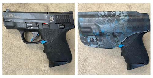 A few details therein: This firearm has a smaller grip which serves the smaller hands of women well, and the recoil from the 9mm round, even with +P Speer Gold Dot 115 grain jacketed hollow point rounds, is manageable. The stock trigger on the Shield was gritty, like there was sand in it. I was unhappy with it, and the trigger is super important in a gun. So I put a custom Apex trigger in this weapon which is MUCH better. It has a smoother pull and the break is crisper. (I am a total trigger snob.) I replaced the horrible stock iron sights with Tritium ones which glow in the dark, but you should replace these every couple of years since the Tritium will fade over time. I put a special extended magazine release to make it easier to release in combat. The color is blue, and the M&P logo on the slide is gold; the total effect is to give the weapon the UCLA colors, a touch I think both of us will appreciate. 👍