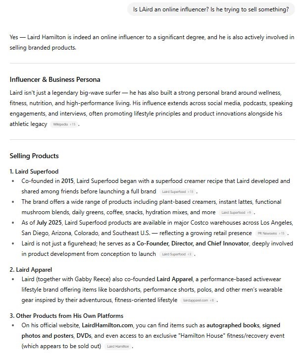 But I did further research on Laird Hamilton afterwards, and I found that he was indeed a social media influencer. He was truly that guy trying to sell something! (Maybe this essay was more about me than Laird?) Here is what ChatGBT said: