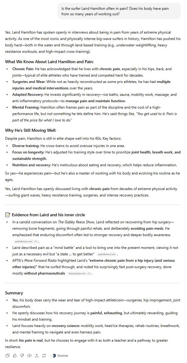 Sure enough, this is what ChatGBT told me when I asked about 61-year old Laird Hamilton and the toll his chosen life path has taken on his body: