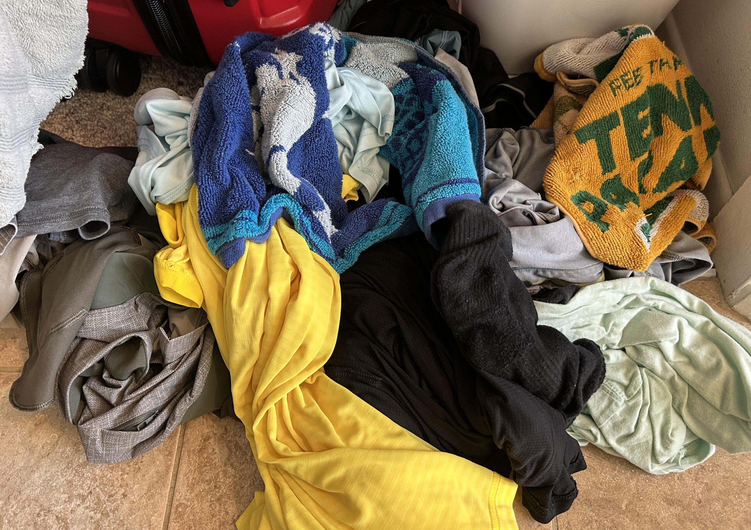 This is the pile of laundry I leave after a hard session of competitive tennis. “Nuclear laundry,” I call it.