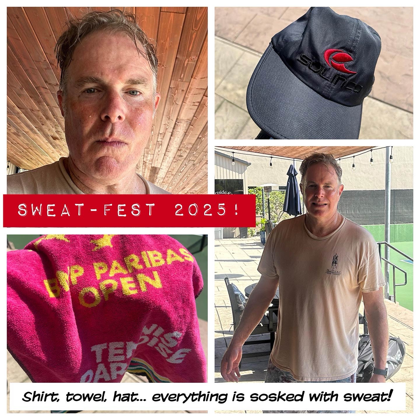 After a shower and a change of clothes, and a meal to re-fuel and re-charge, I will feel like a new man. But until I get home I’m wearing these sweat-drenched clothes, yuck. I will feel like a million dollars an hour after stepping off the tennis court, but those wet clothes hanging off me meanwhile, yikes.